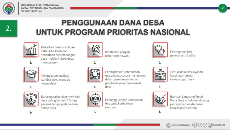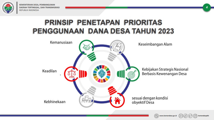 Prioritas Penggunaan Dana Desa tahun 2023 diarahkan untuk percepatan pencapaian tujuan SDGs Desa meliputi: